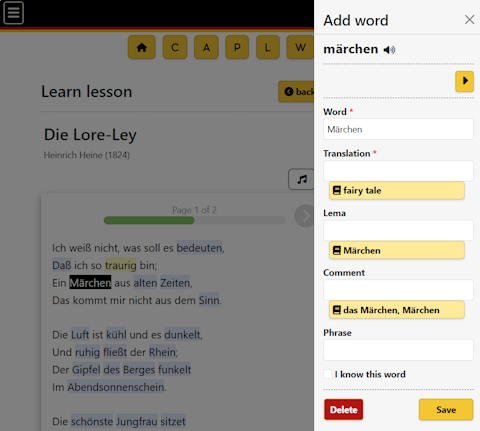 Create your own lessons or use public lessons to increase your vocabulary. As you go through lessons, you can add words to your list of words. These words will be highlighted in lessons with different colors, and the words will be interactive, allowing you to change the word's data at any time.