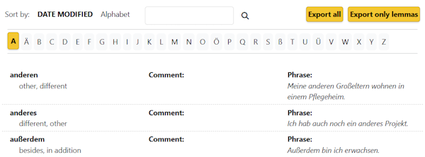 Access the list of your words at any time. You can filter the words, search and even download your words so you can use them in some other way.