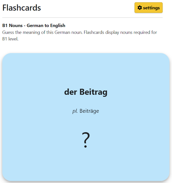 Even though flashcards are a simple tool that can help you learn foreign languages, these flashcards are configurable and targeted for the German language. If you click on the button "Settings", you will be able to configure your flashcards.