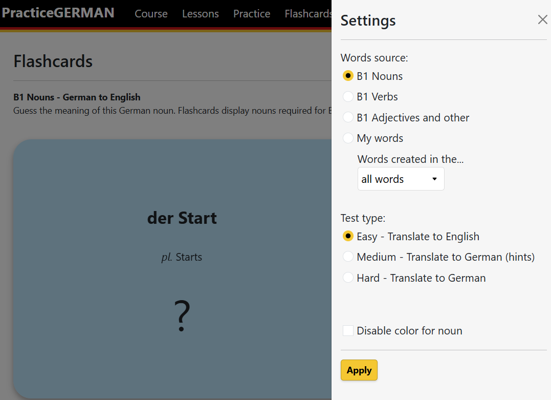 The first thing you can select is the source of the words. You can display flashcards for B1 nouns, verbs and adjectives along with other words. The list of these words is published by the Goethe Institute, and the document with these words can be found on this web page (the document from the Goethe Institute has no translations to English).